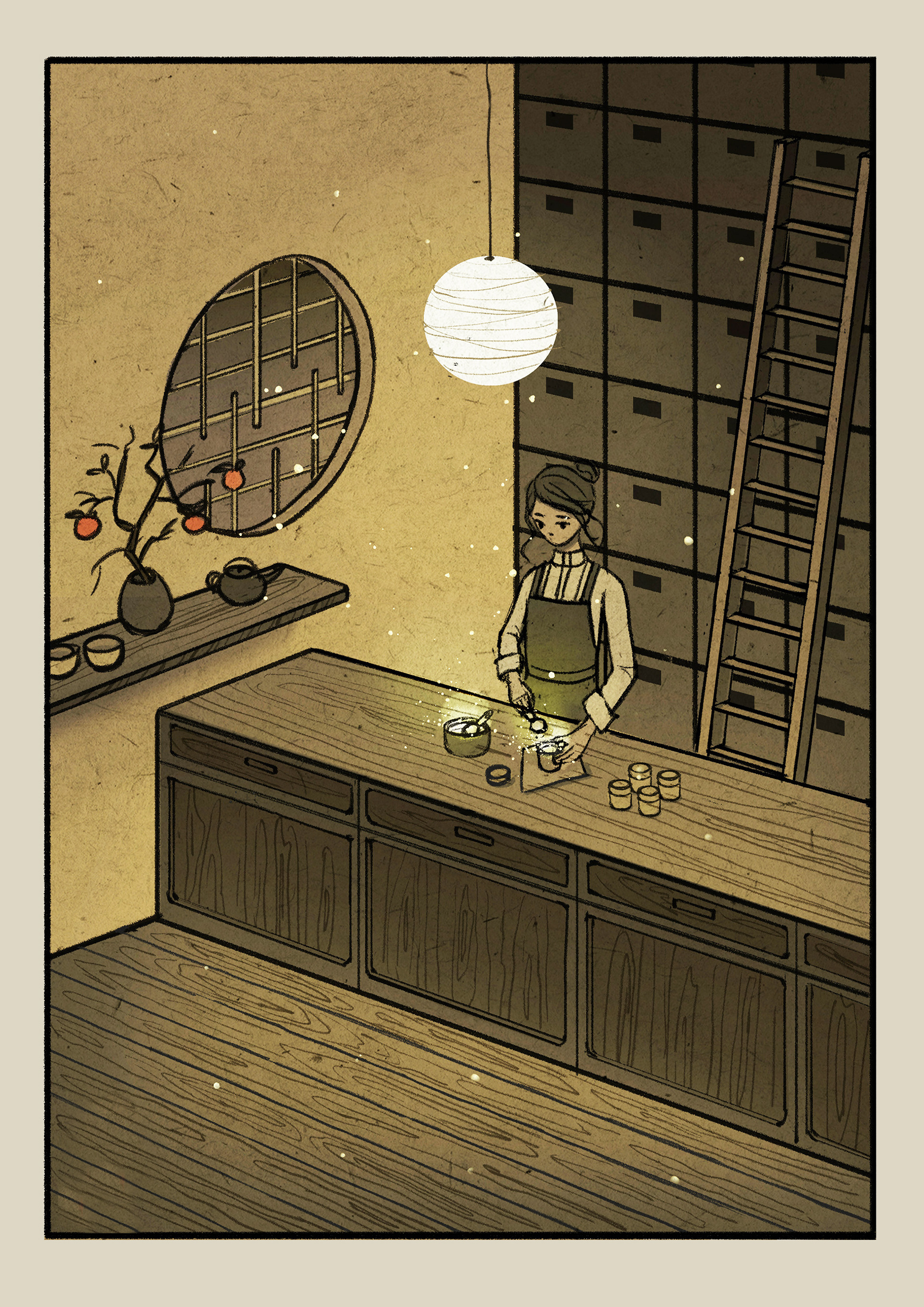 Illustrations of a fictional tea store done for Hikari tea (hikaritea.com).