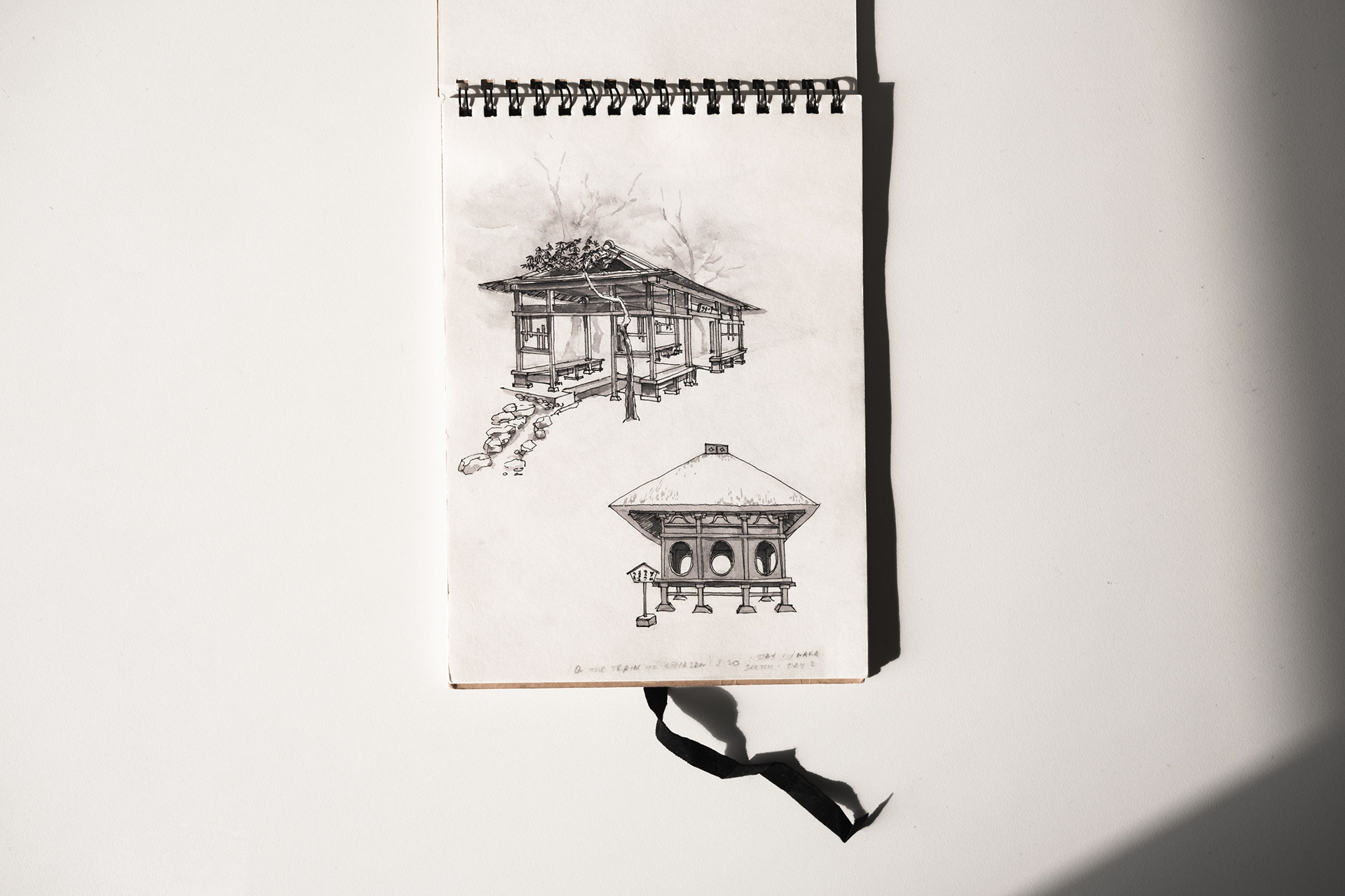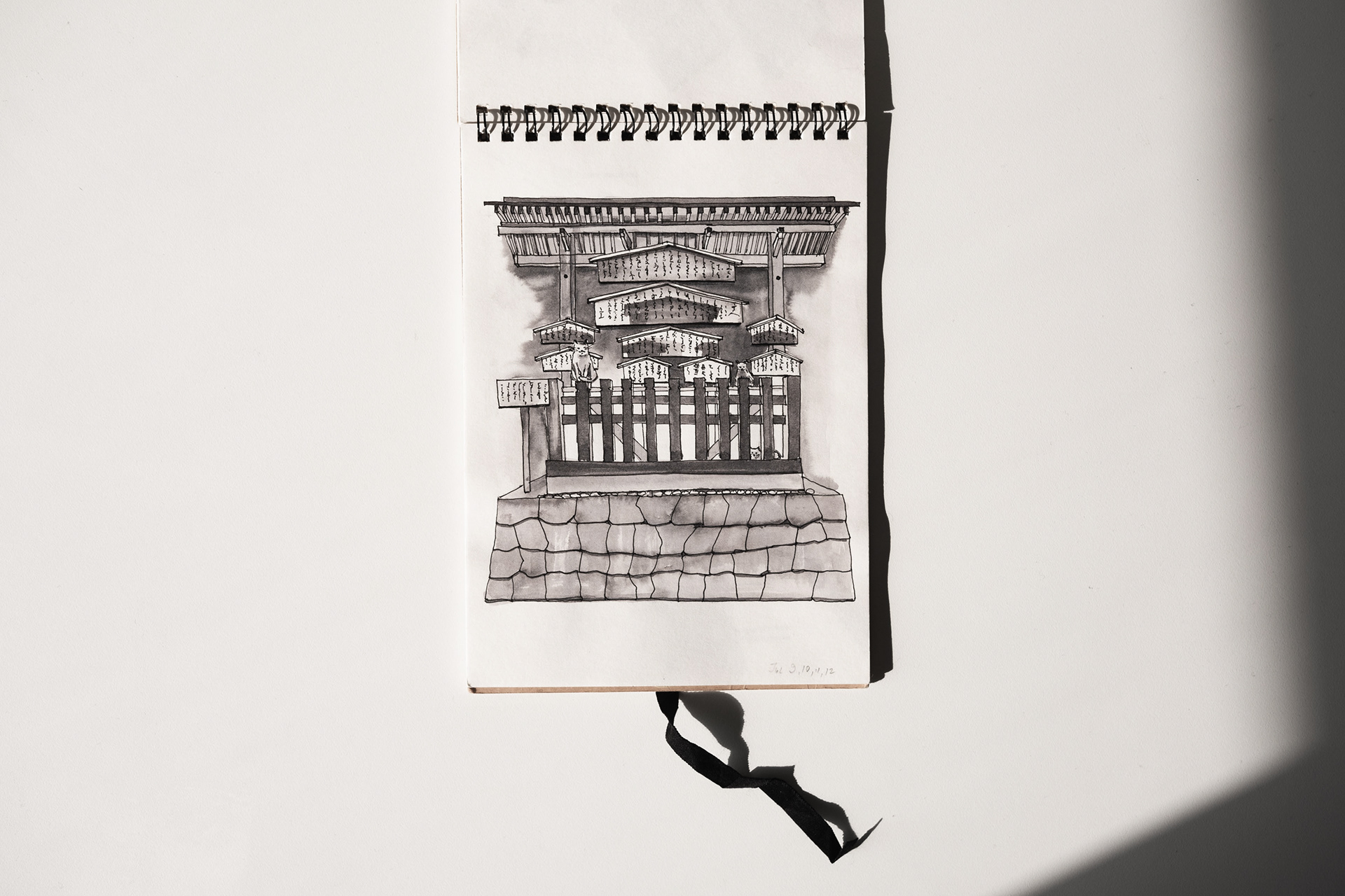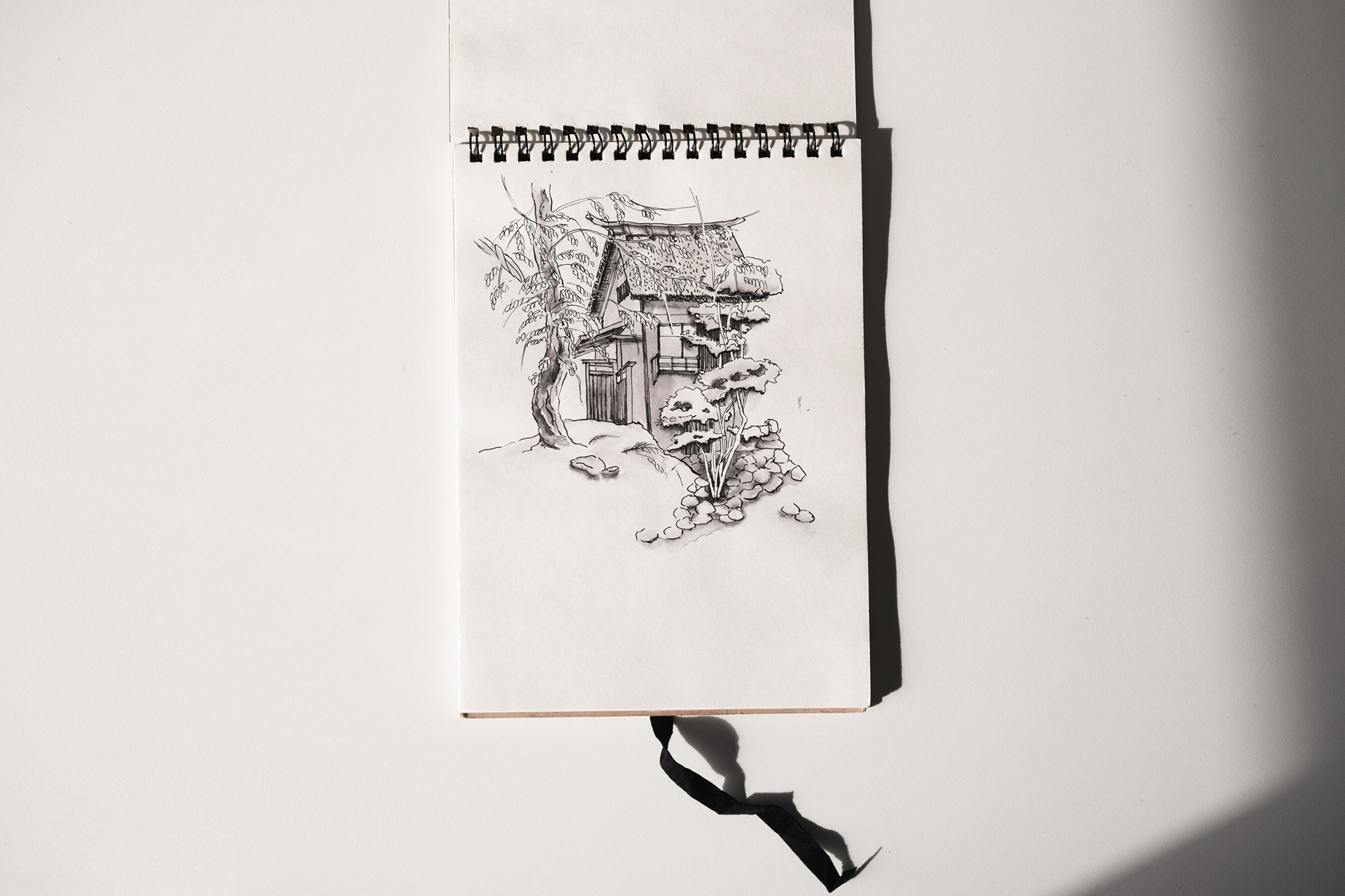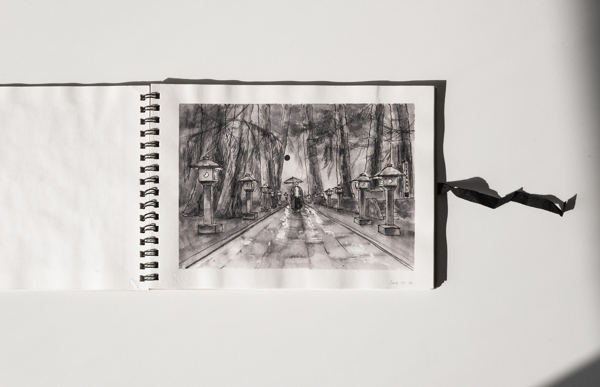 Muji sketchbook (A5), pen & ink, grey ink wash, black masking tape on the cover.