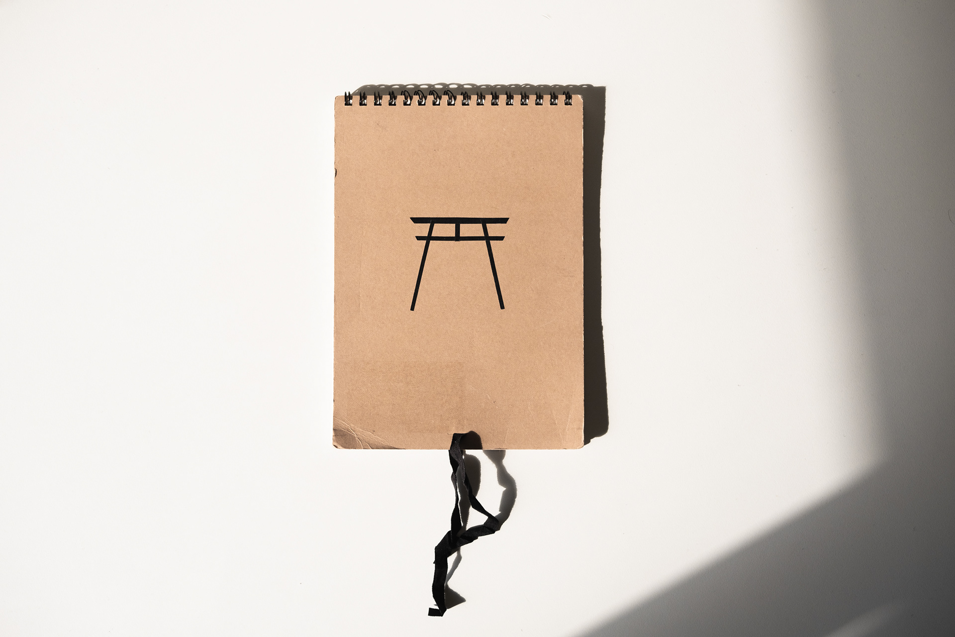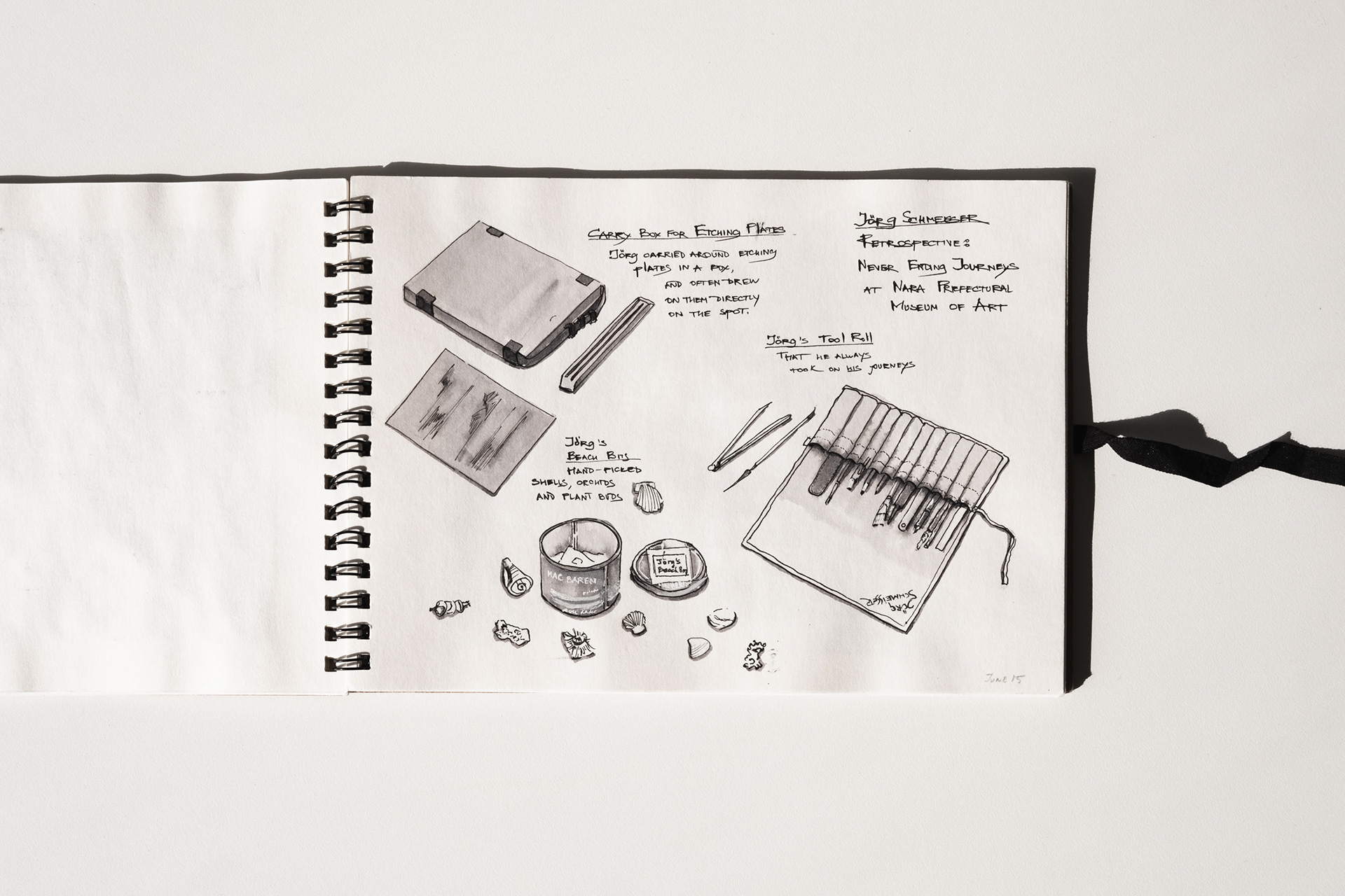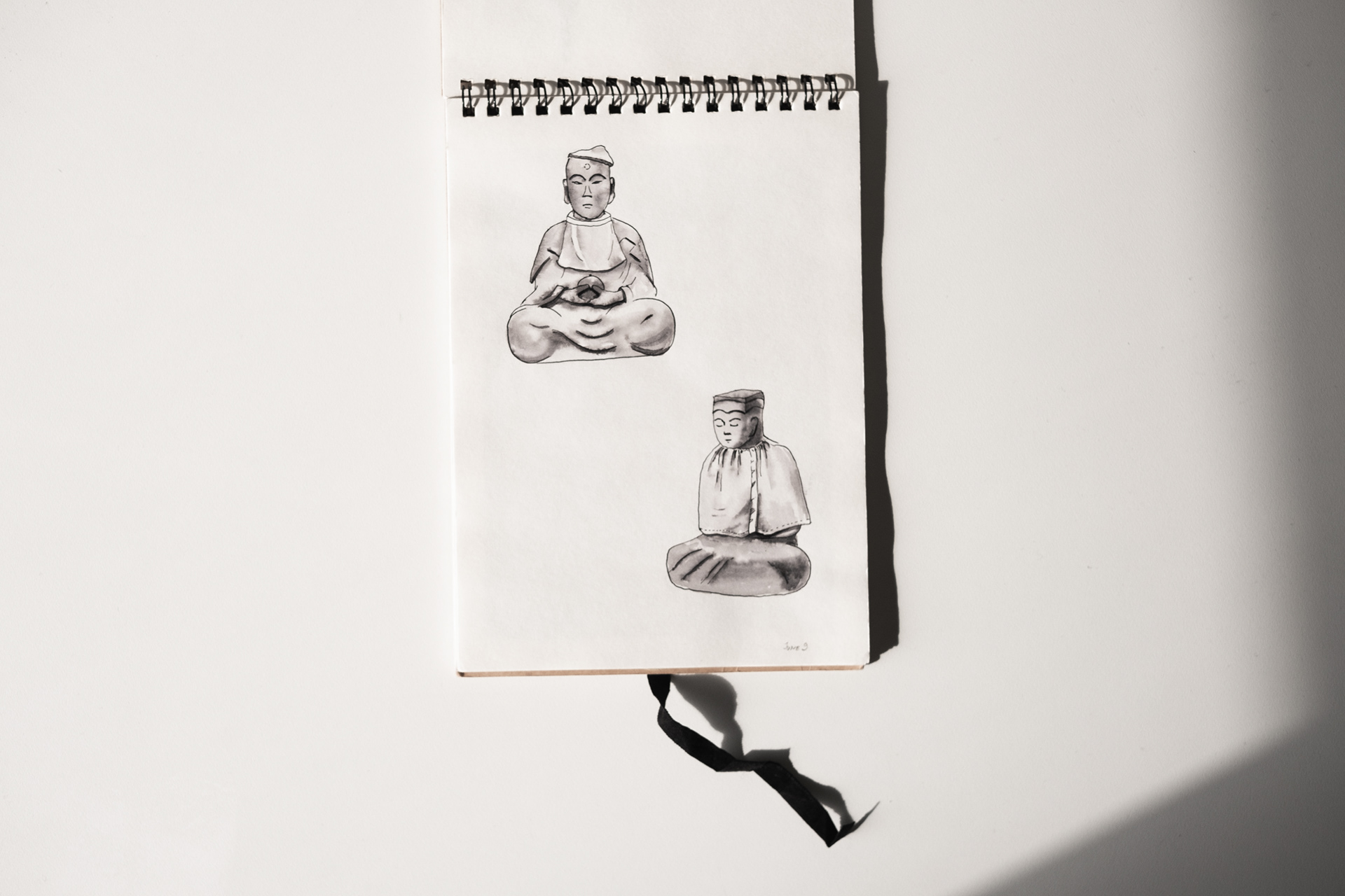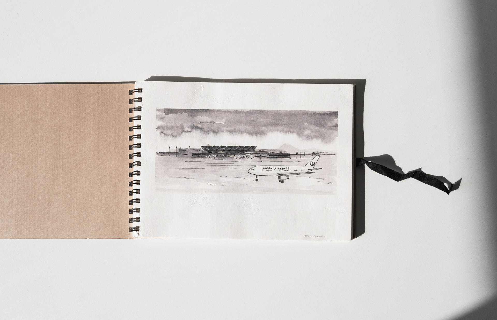 Muji sketchbook (A5), pen & ink, grey ink wash, black masking tape on the cover.