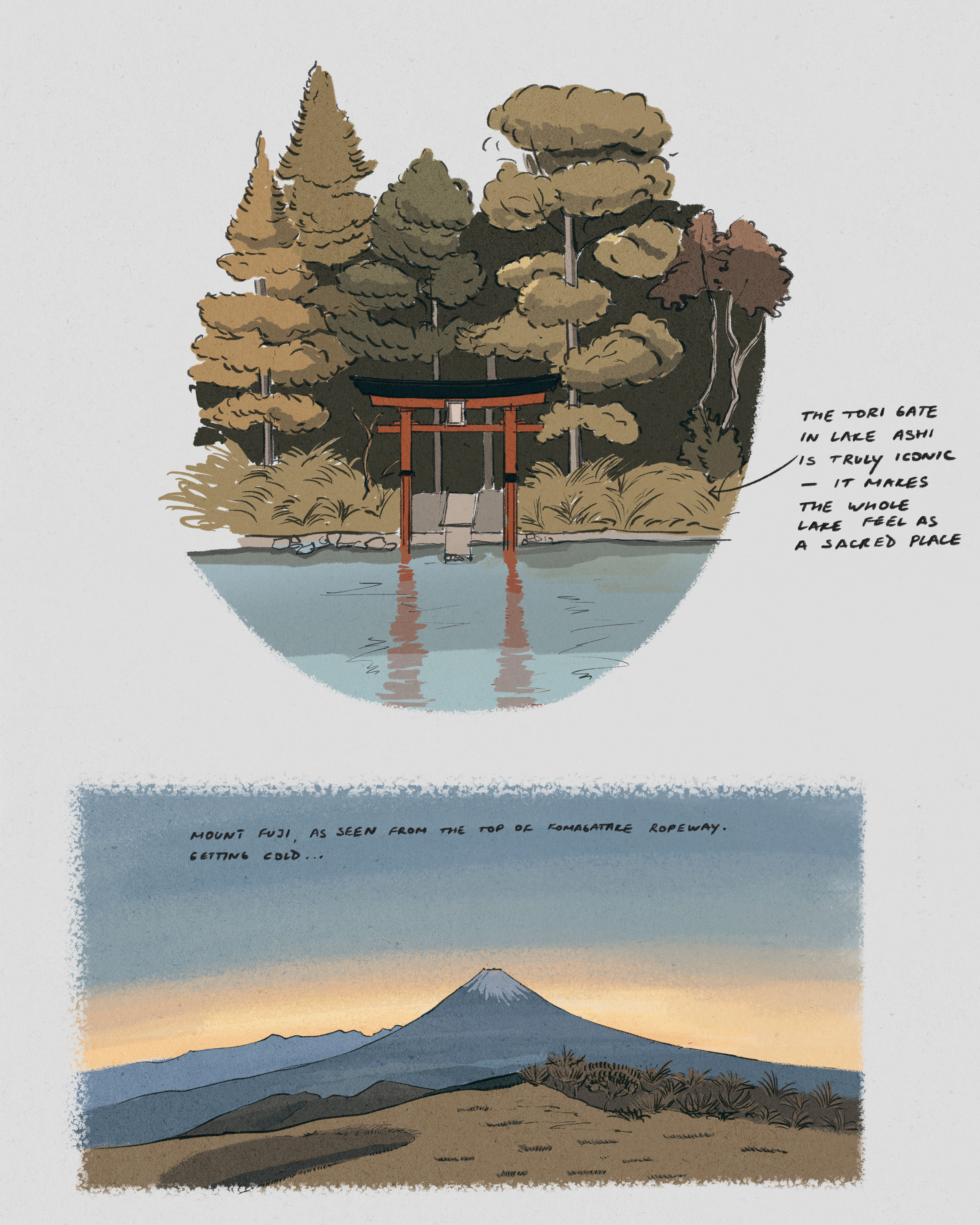 Sketches and notes to capture observations from a trip to Hakone.