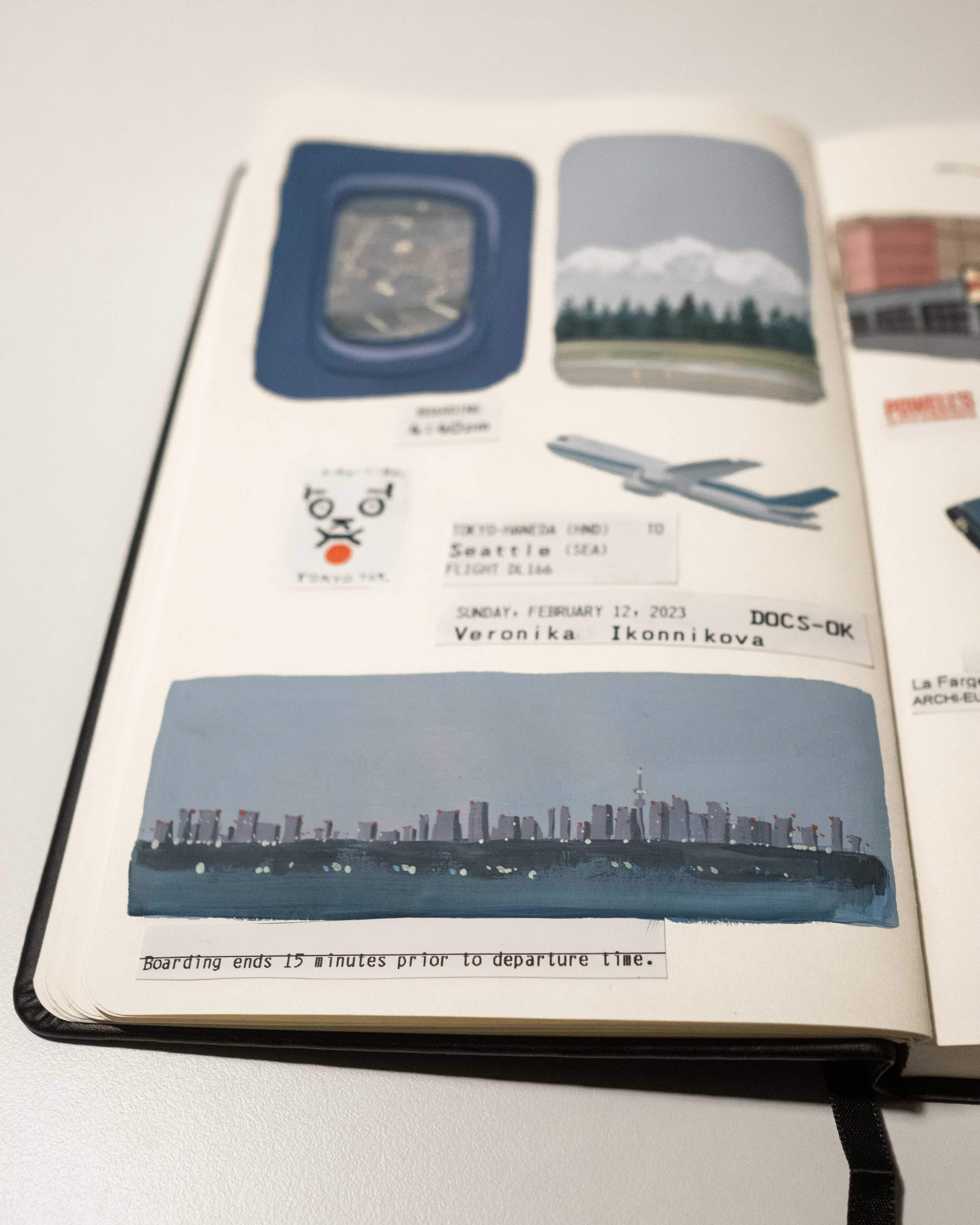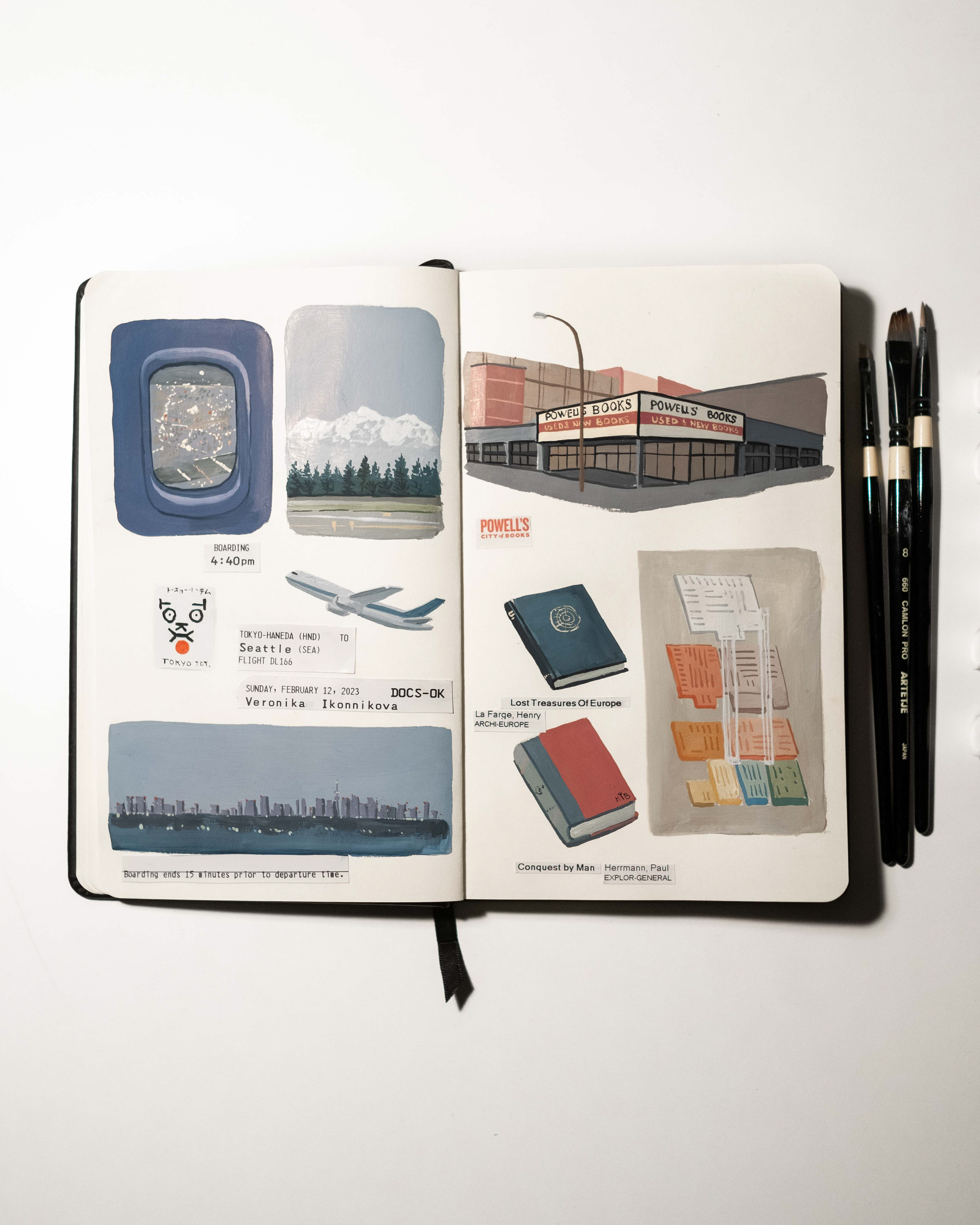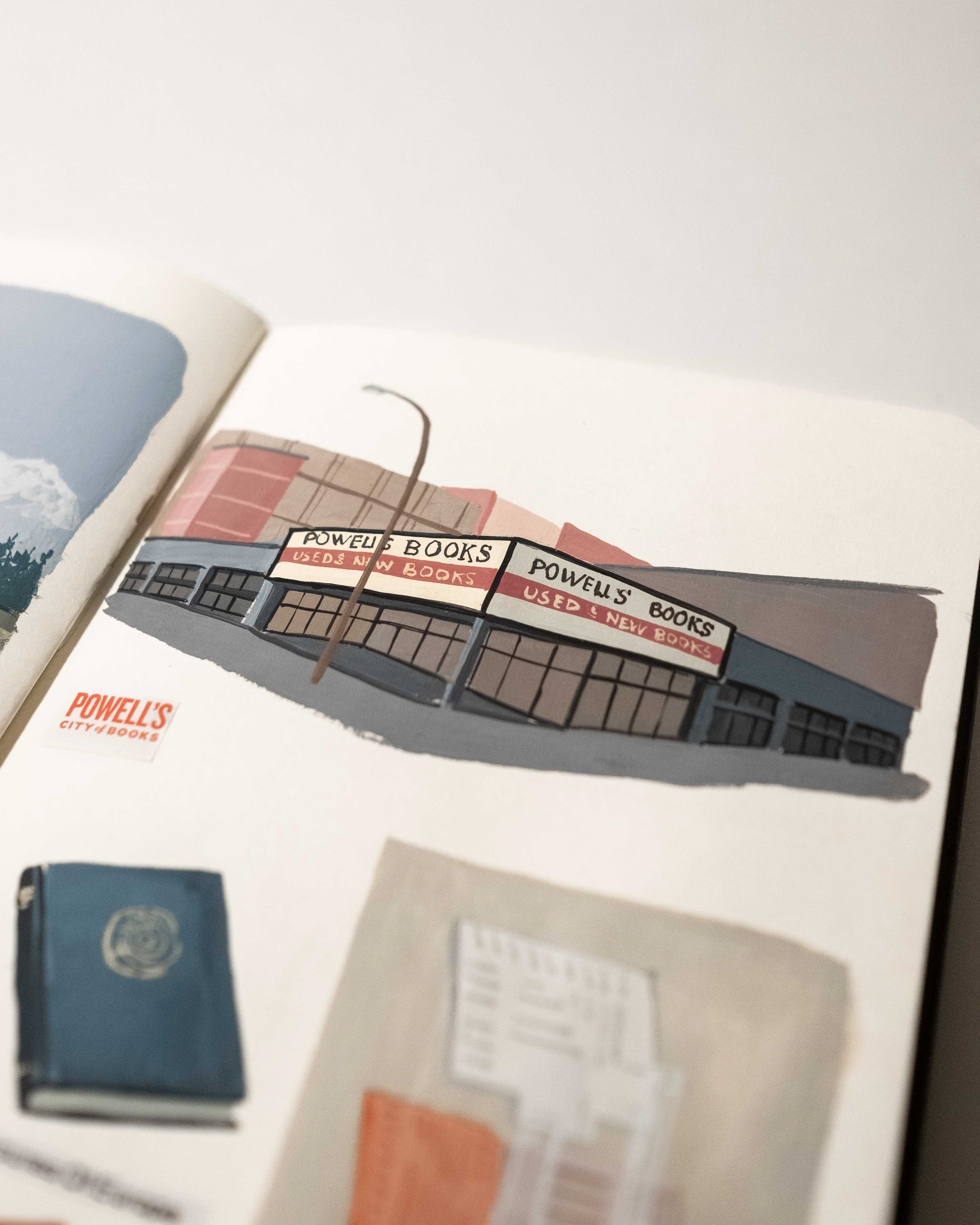 A sketchbook spread done with nicker poster color featuring some moments of the Portland trip in February 2023.